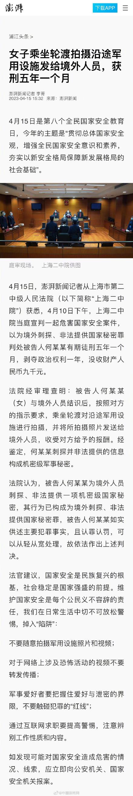 4月15日,记者从上海市第二中级人民法院(以下简称“上海二中院”)获悉,4月10日下午,上海二中院当庭宣判一起危害国家安全案件,以为境外刺探、非法提供国家秘密罪判处被告人何某某有期徒刑五年一个月,剥夺政治权利一年,没收财产人民币九千元。(澎湃新闻)