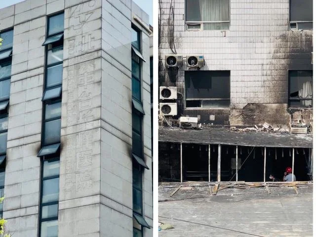 19日上午,潮新闻记者探访长峰医院,看到住院大楼墙外有发黑的yan熏痕迹,被烧变形的壁挂空调、病房破碎的玻璃窗诉说着昨日大火的惨烈。