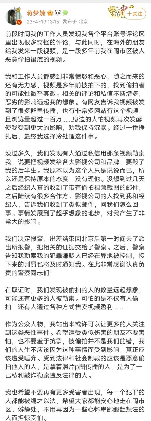 4月19日,蒋梦婕在社交平台发文称,多年前被恶意偷拍裙底,近日又因为该视频遭勒索,严重影响其工作生活,目前报警后嫌疑人已在异地被控制。作为公众人物的蒋梦婕呼吁遭受类似伤害的人不要害怕,不要羞于抗争,应让实施侵害的人受到法律和社会的制裁。